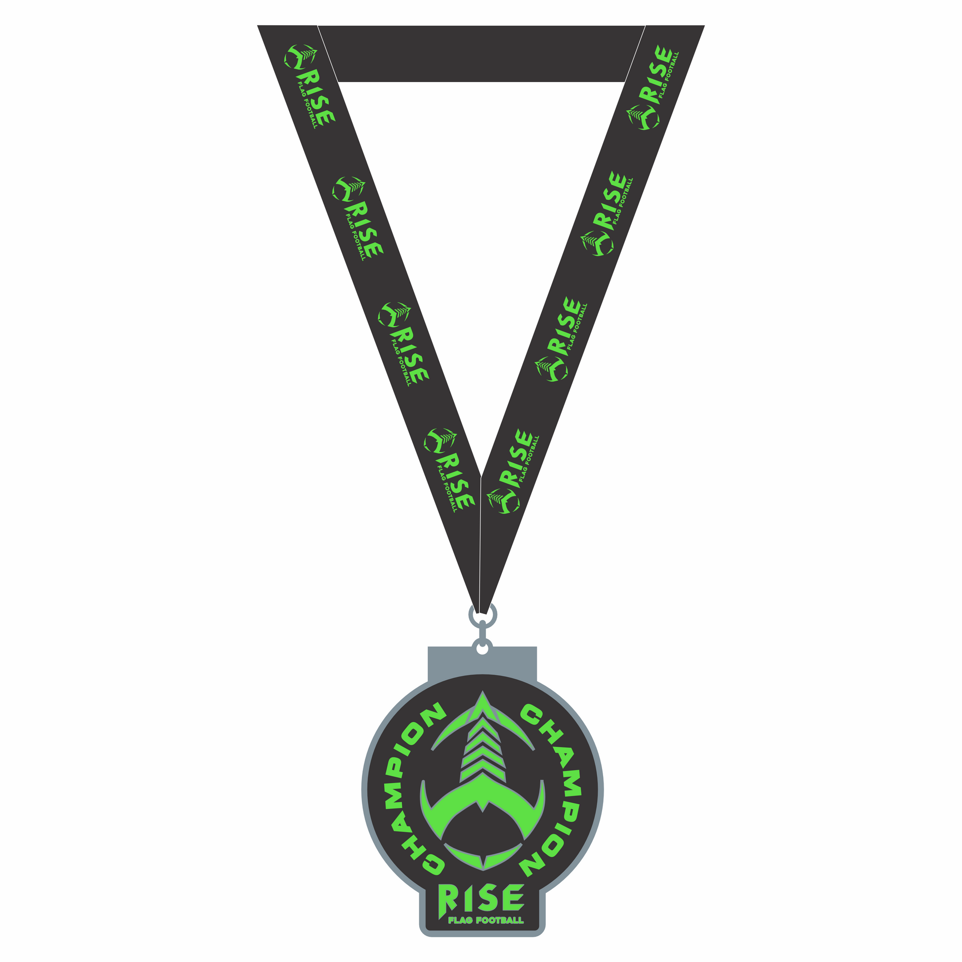 Large 3" Diameter Medal with Champion Graphic Insert. Black lanyard comes complete with RISE logo in hyper green.